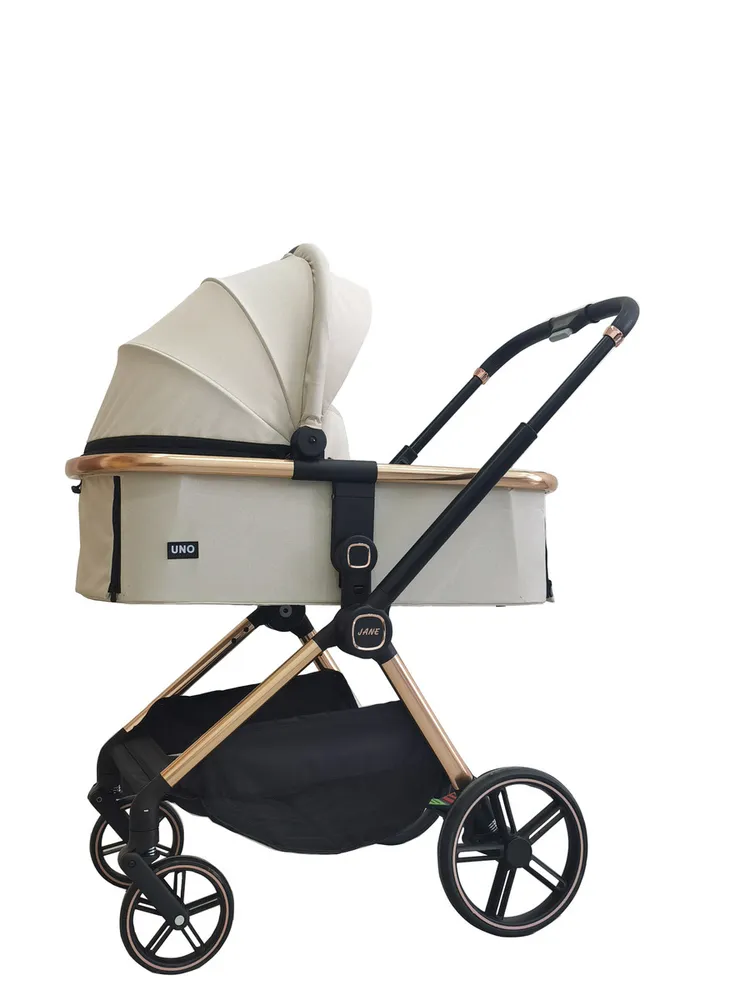 עגלת תינוק -ג'אנה JANE מבית UNO צבע שמנת מרכב רוז גולד עגלה משולבת הכוללת אמבטיה וטיולון דו כיווני בעיצוב מדהים