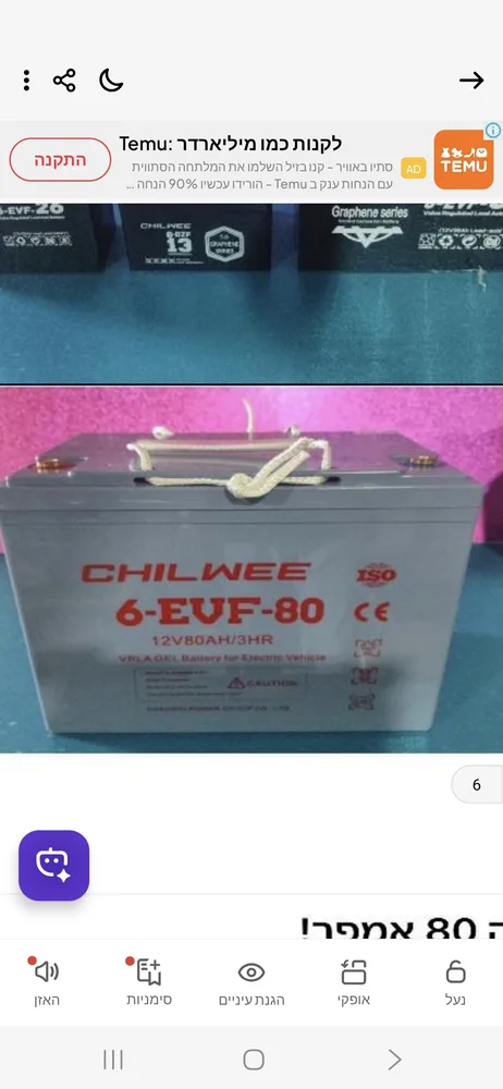 מצבר ג'ל 12V/80A של חברת CHILWEE מותאם לקלנועיות או קלאב קאר ועוד