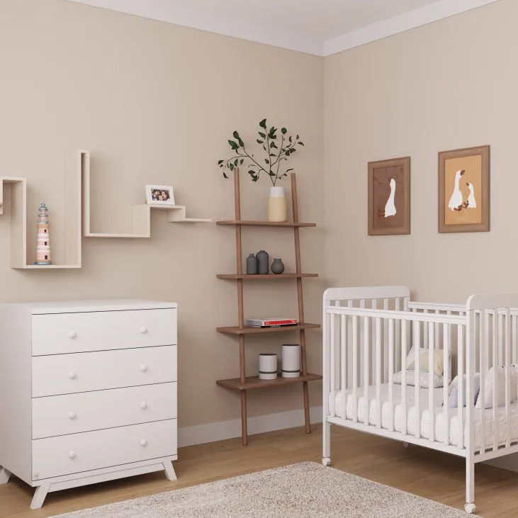 החדר כולל שידת דוראל בייסיק קלאסית ו־מיטת תינוק סחלב קטנה, שילוב חכם שמתאים במיוחד לחדרים קומפקטיים – בלי להתפשר על נוחות או איכות.