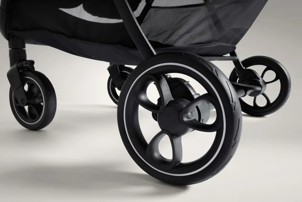 גלגלים ובולמי זעזועים: ארבעה גלגלים עמידים בפני תקרים (Puncture-proof) עם מערכת בולמי זעזועים מובנית בכל הגלגלים, המבטיחים נסיעה חלקה ונוחה בכל תוואי שטח.