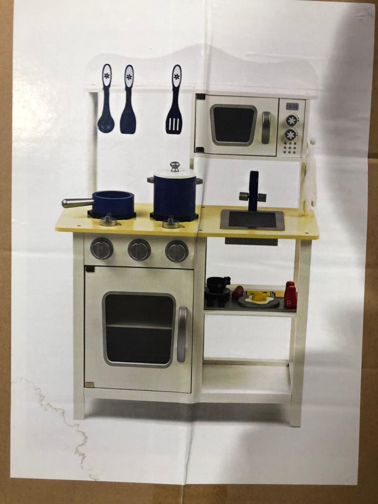 מטבח מעץ לילדים כולל תנור כיור עם ברז מיקרוגל ואביזרי בישול..