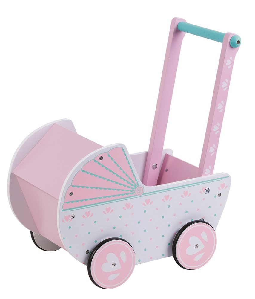 עגלה מעץ לבובה מבית פיט טויס מידות: גובה 47 ס”מ, אורך 47 ס”מ, עומק 26 ס”מ. מתאים לבובות עד גובה של 45 ס”מ לגילאי שנה וחצי ומעלה