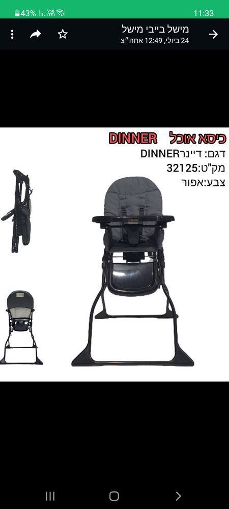 כסא אוכל מתקפל קומפקטי דגם דיינר Dinner מבית בייבי מישל