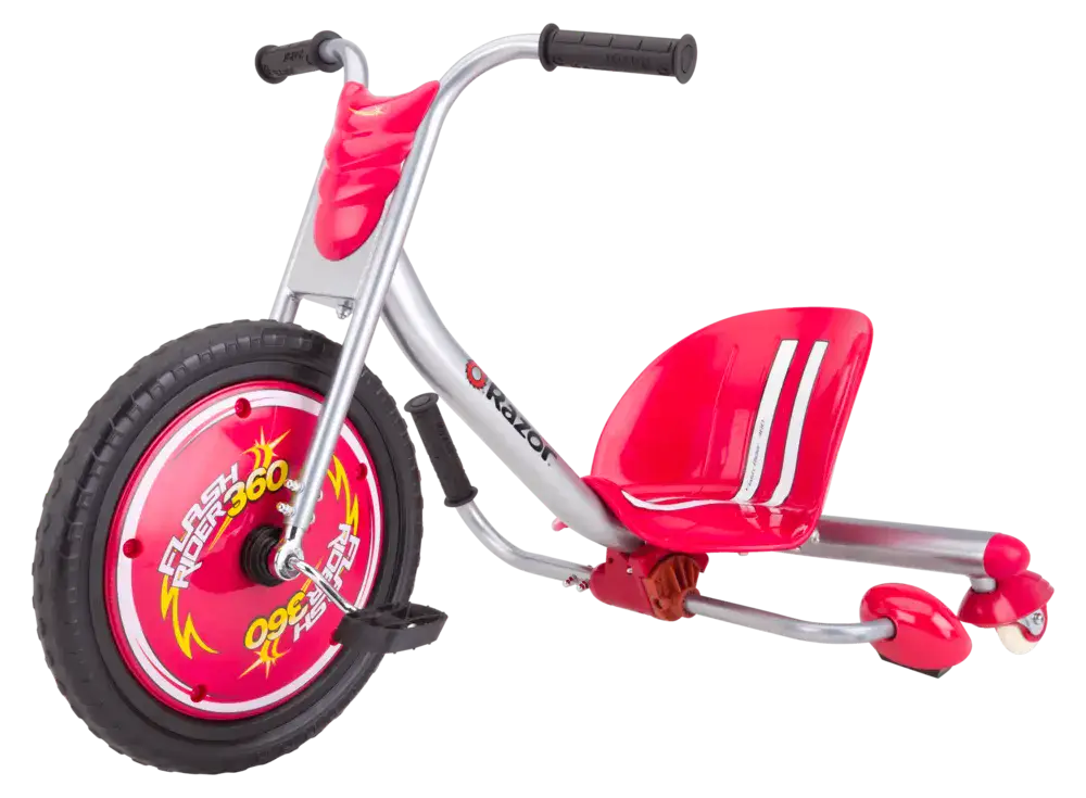 ' + דגם חדש ומשופר ללהיט הפעלולים FLASH RIDE 360 מבית ריזור RAZOR תלת אופן עם אפשרות סיבוב של 360 מעלות, גלגל קדמי ענק עם פדלים קשיחים, גלגלים אחוריים עם אפשרות סיבוב מלאה מורידים את הידית ומפזרים ניצוצות מגניבים מתאים לילדים מגיל 6 עד 11 (משקל נשיאה מקסימאלי 73 ק"ג) נדרשת הרכבה ראשונית ע"י מבוגר
