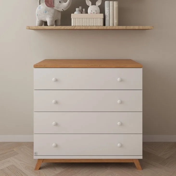 השידה עשויה MDF דחוס ואיכותי, חומר גלם חזק ויציב שמעניק תחושת ביטחון לאורך שנים. הגימור במלמין גלוס מעניק מראה אחיד, חלק וקל לניקוי – אידיאלי לשימוש יומיומי בחדר תינוק.