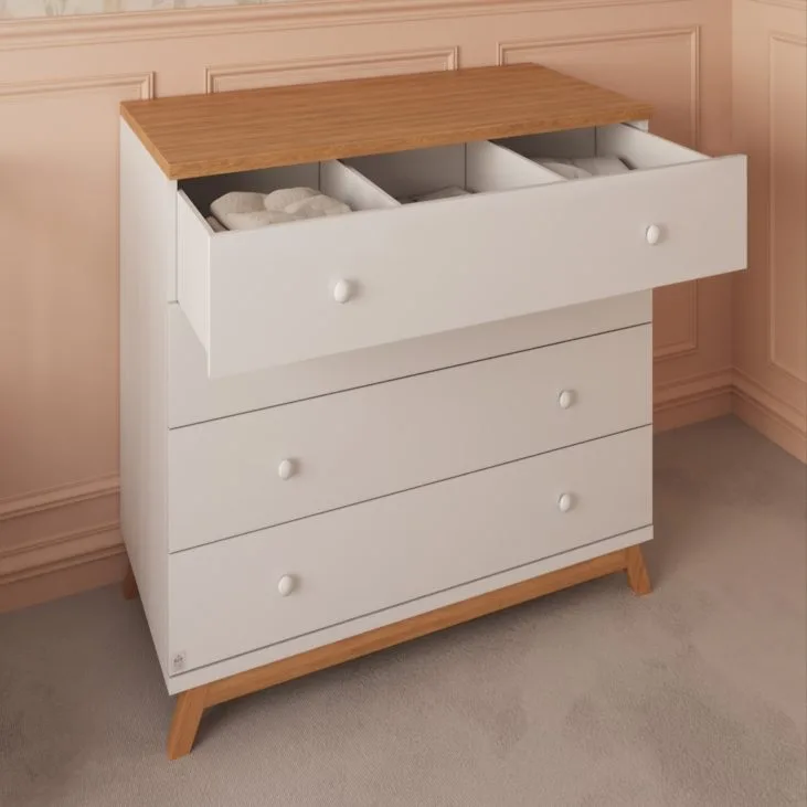 המגירות מצוידות במסילות טריקה שקטה איכותיות, לפתיחה וסגירה חלקה ושקטה במיוחד – גם בשעות הלילה. המגירה העליונה מחולקת לתאים פנימיים, המאפשרים סדר מושלם של חיתולים, בגדי גוף, אביזרים ופריטים קטנים, כך שכל דבר נמצא בדיוק במקום שלו.